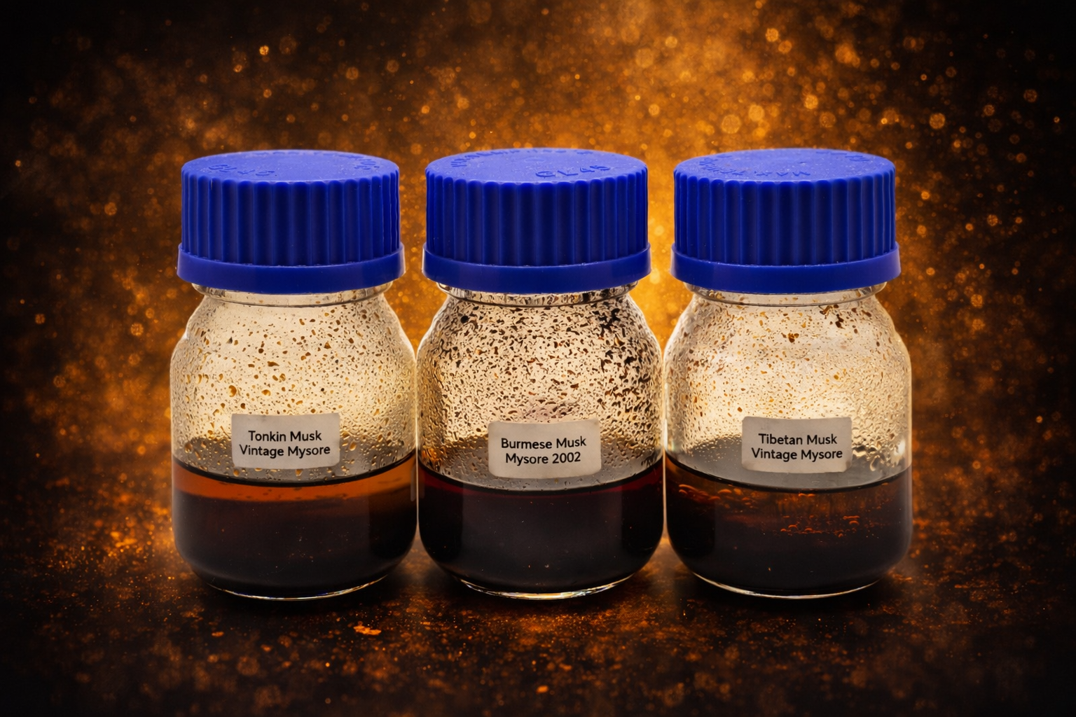 Musk Mélange is a rare union of three historic musk macerations, Tonkin, Burmese, and Tibetan, slowly married inside aged Mysore sandalwood from 2002.